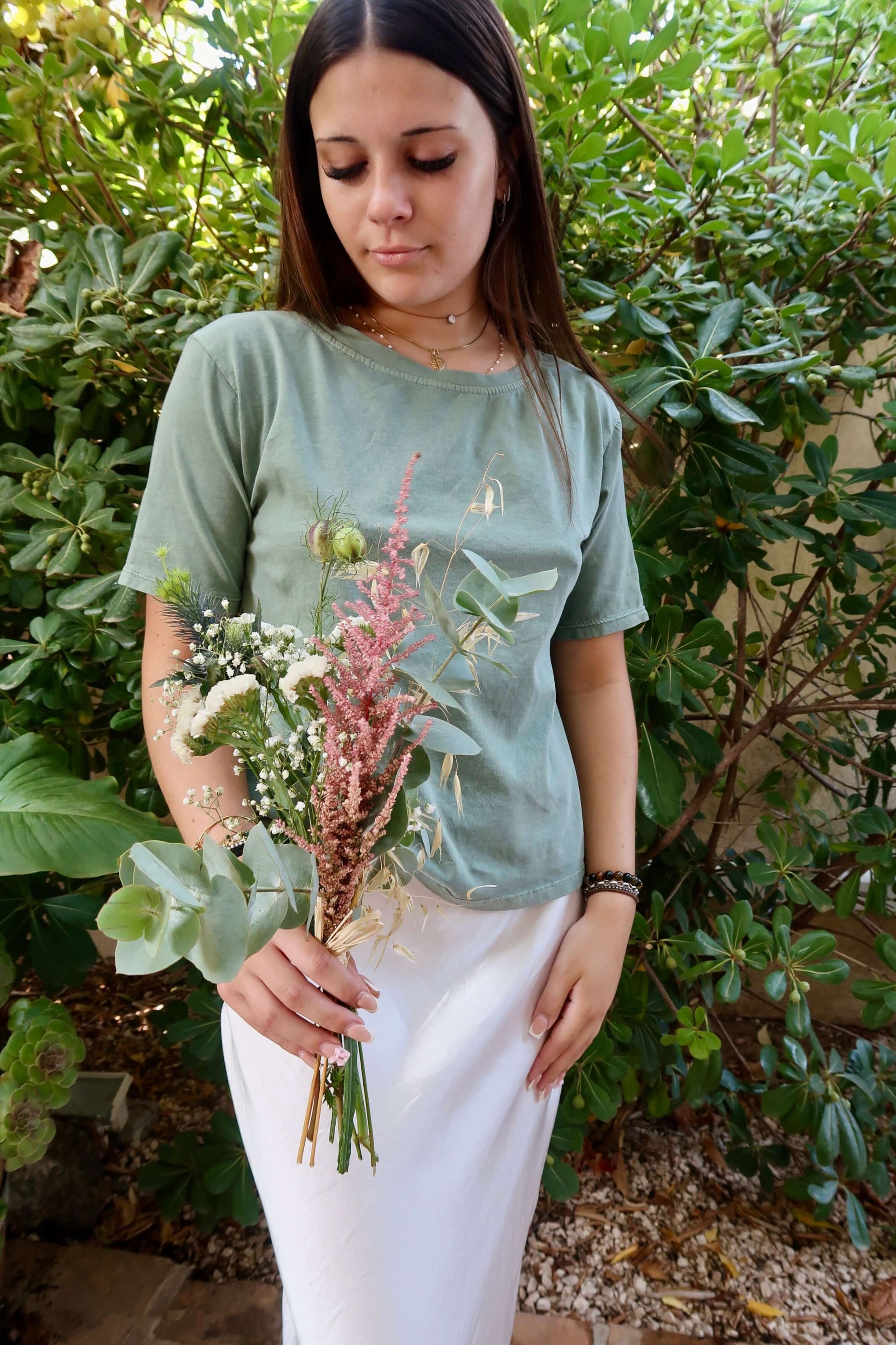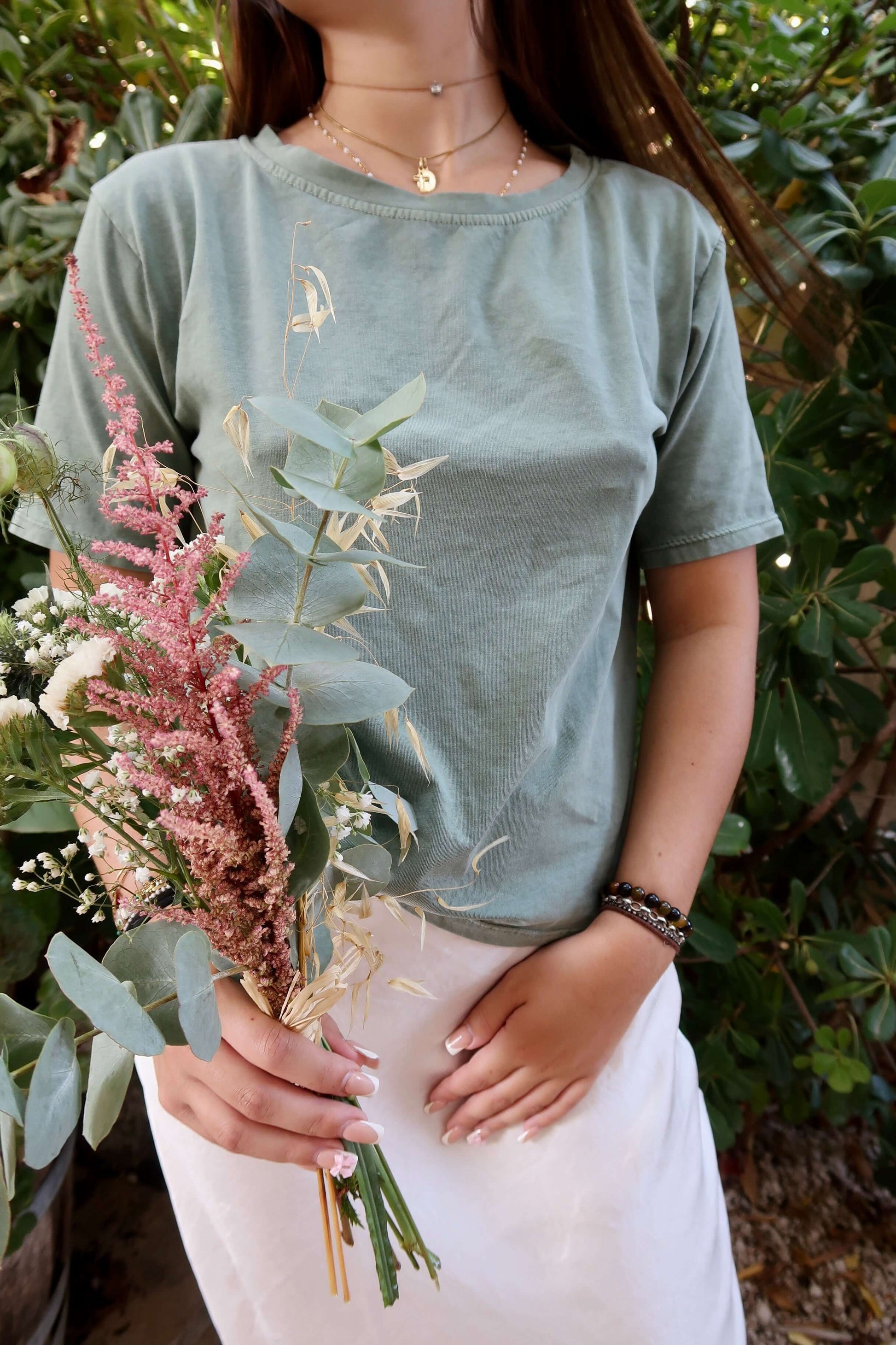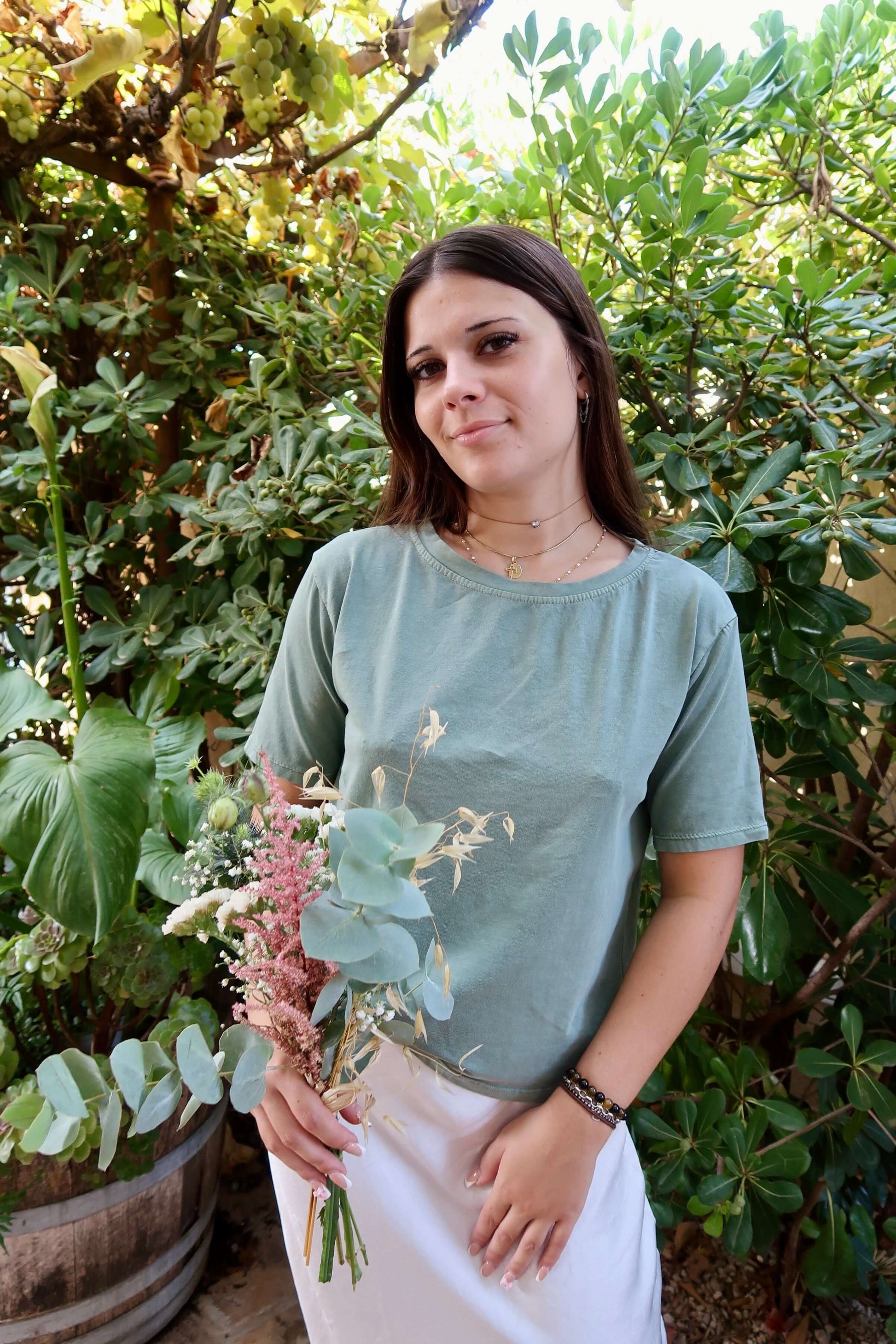 Top en coton kaki à manches courtes, présentant un effet retroussé pour une touche décontractée.
